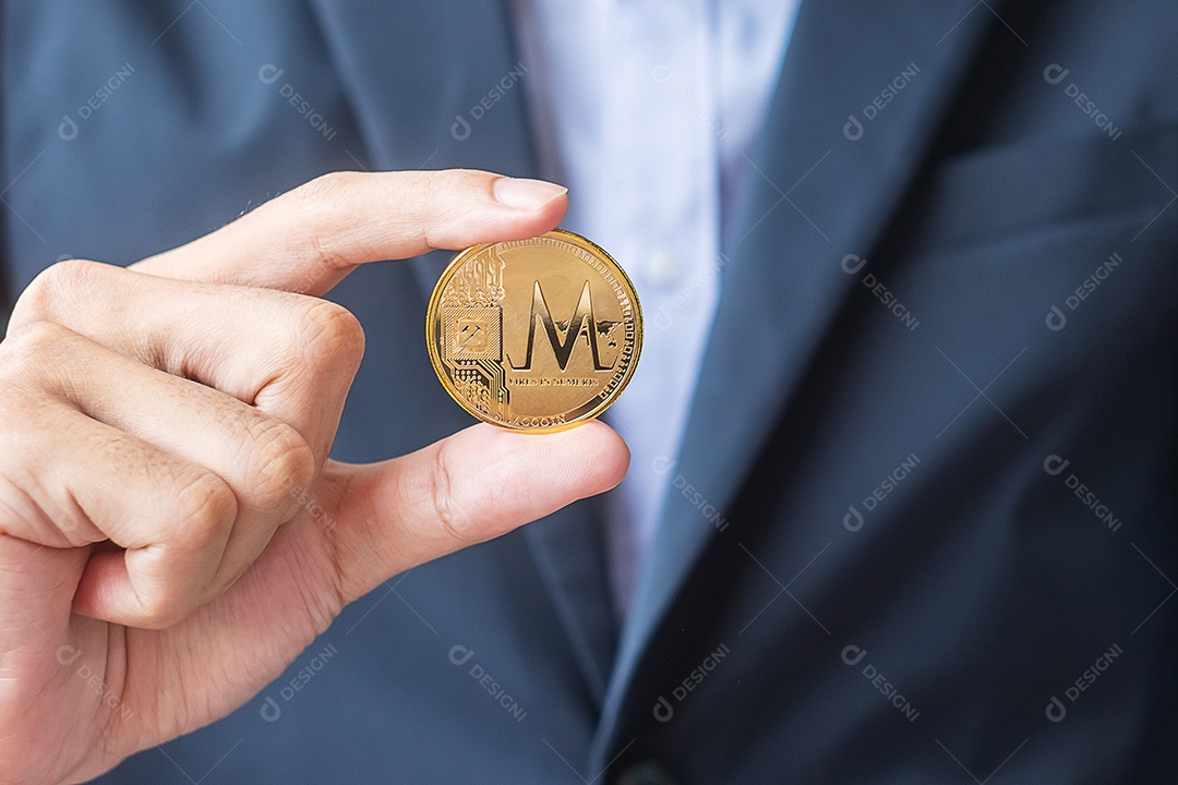 mão de homem segurando a criptomoeda MCcoin de ouro, Crypto é Digital