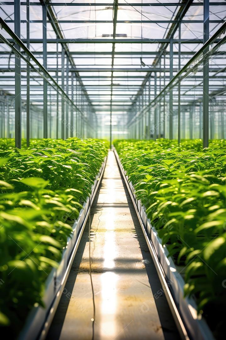 Estufa com variedade de verduras e legumes que crescem exuberantes em ambiente protegido.