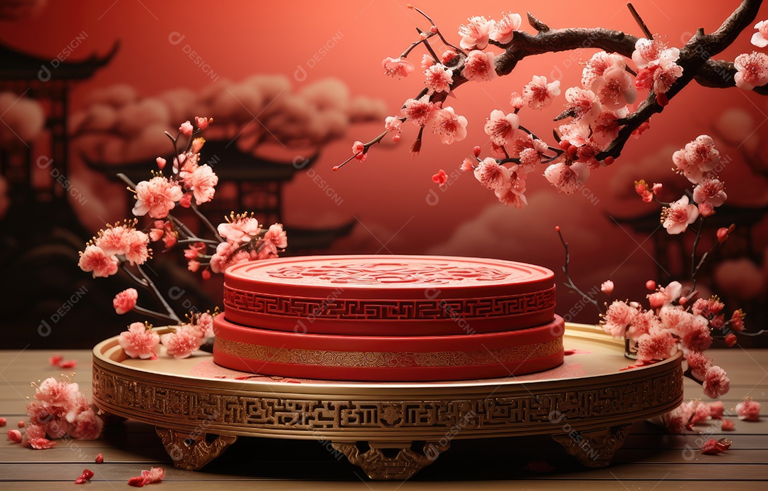Pódio de cilindro vermelho para apresentação de exibição de produtos, ano novo chinês, festivais chineses, Festival do Meio Outono, cartaz, cartão de felicitações