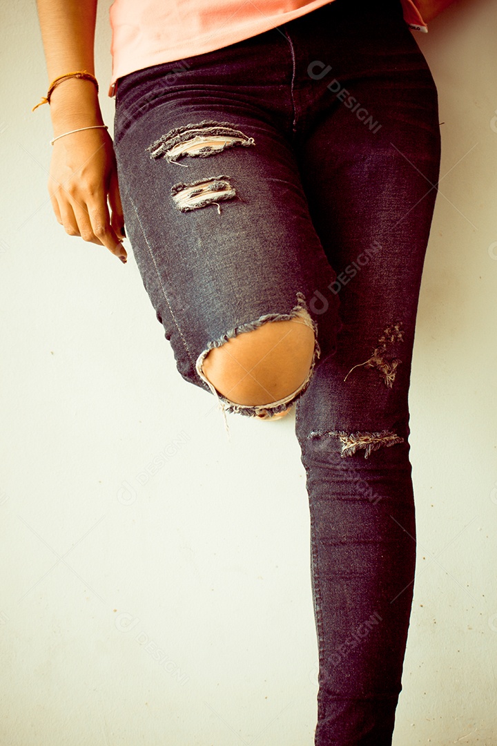 Detalhe da mulher vestindo jeans, fundo de tom vintage