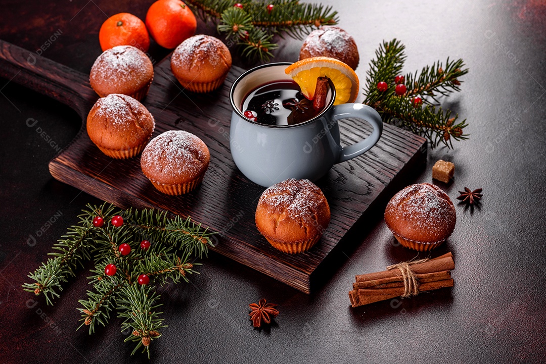 Lindos e deliciosos muffins de cacau fresco na mesa de Natal.