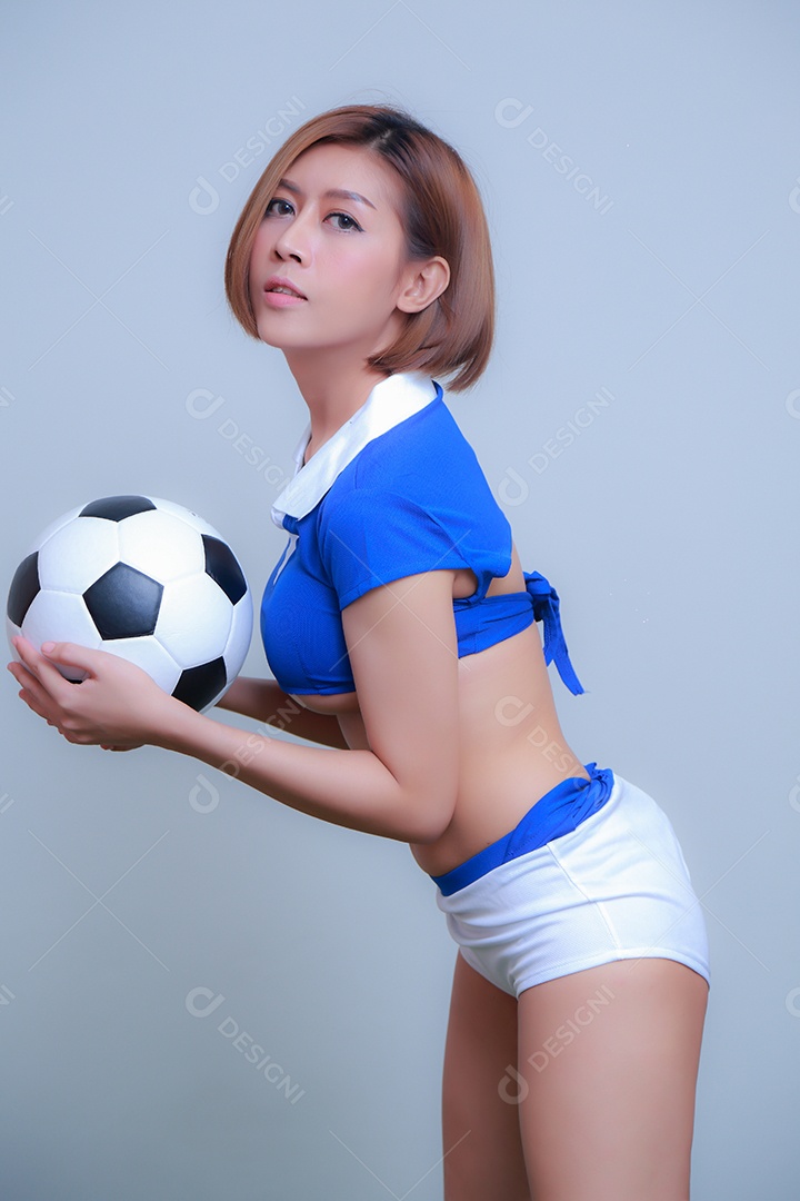 Linda e sexy líder de torcida posando de mulher vestida com roupas esportivas, jogando futebol em fundo branco.