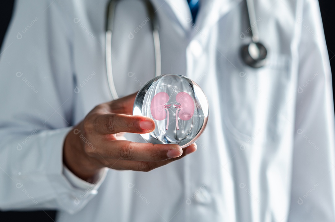 Médico em um jaleco branco segurando órgão renal, doença renal crônica