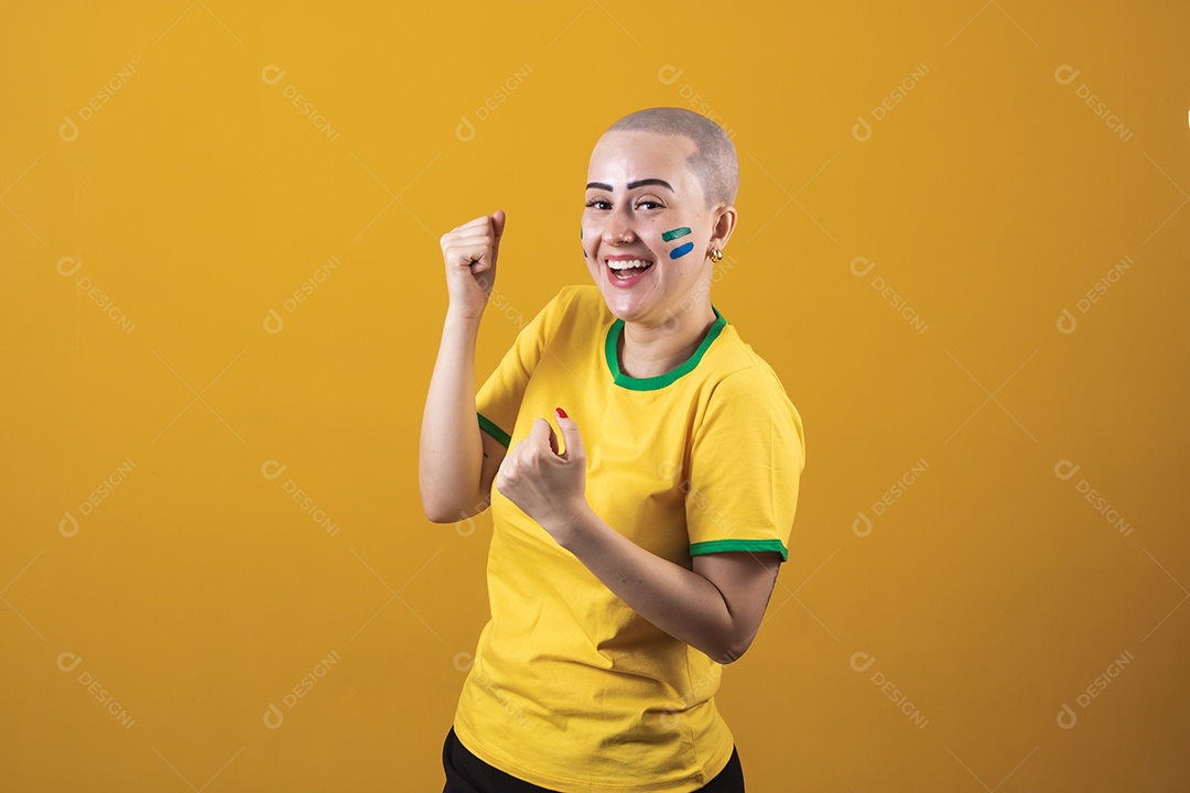 Linda mulher jovem careca usando camiseta do Brasil, torcedora do B...