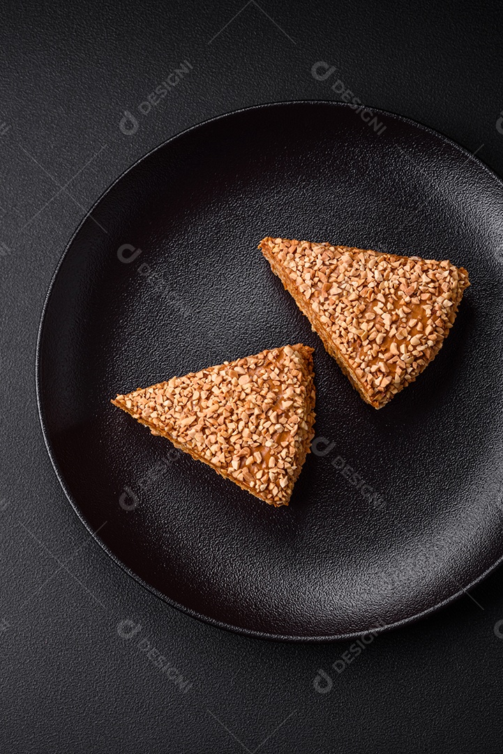 Delicioso bolo de waffle doce com creme e nozes cortados em pedaços...