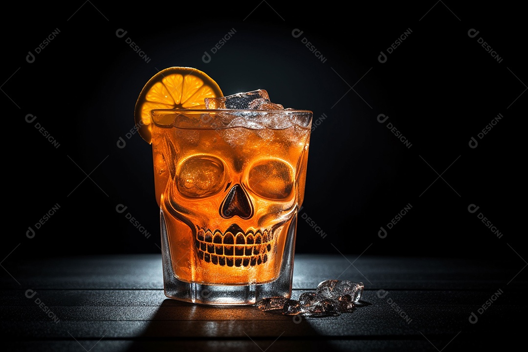 Bebida picante de Halloween com cubo de gelo enfeite fatia de laranja decorada com crânio em fundo preto.