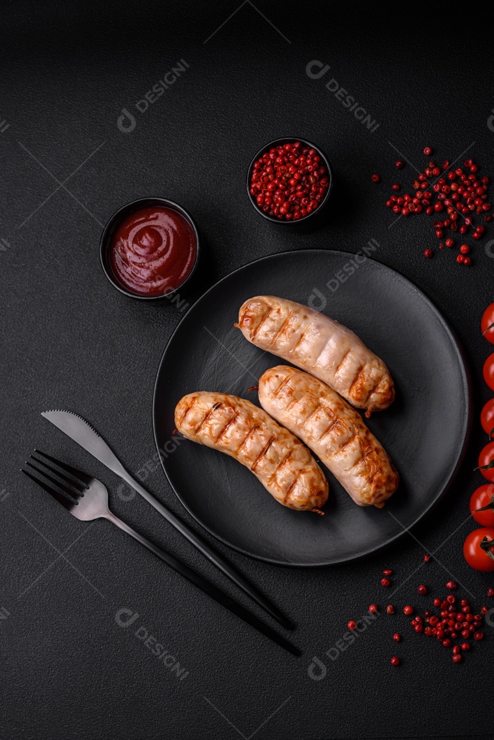 Deliciosas salsichas grelhadas de frango ou carne de porco com sal,...