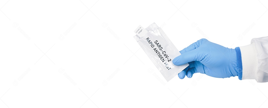 Mão de pessoal médico mostrando envelope de rapi de antígeno Covid-19