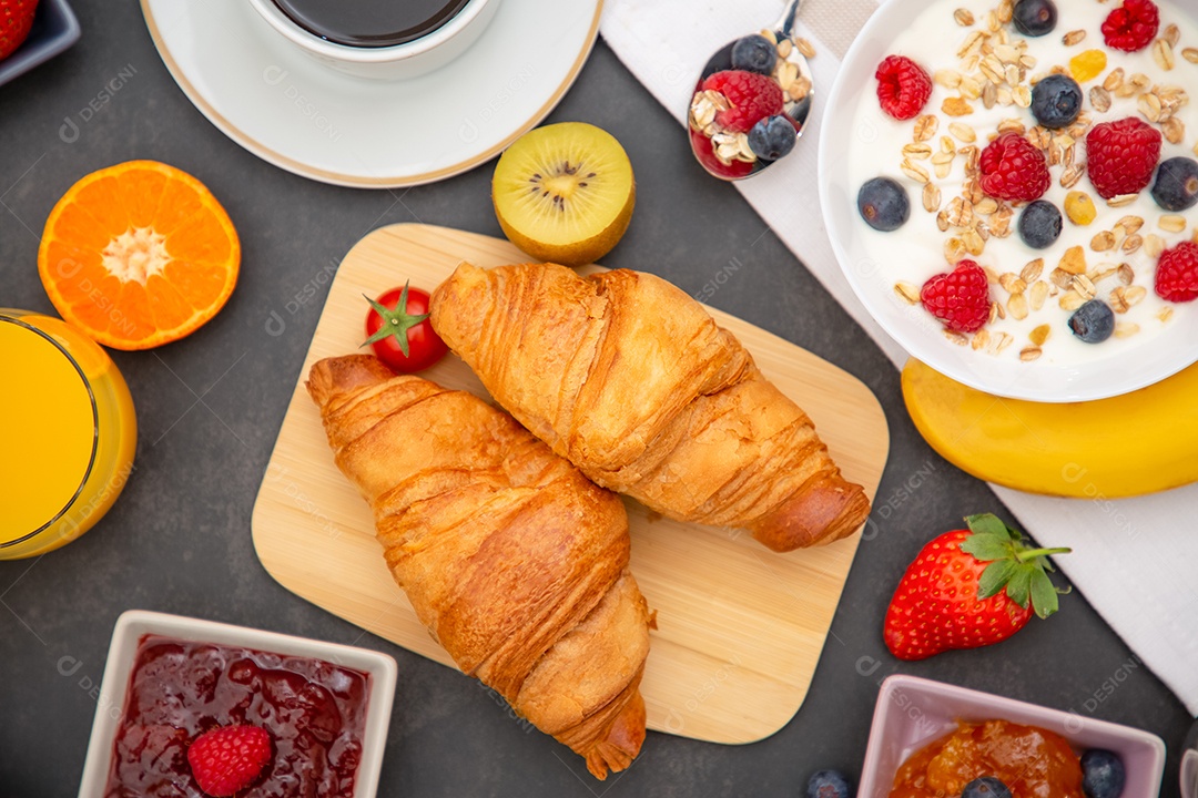Café da manhã Servido pela manhã com café preto quente e croissants...