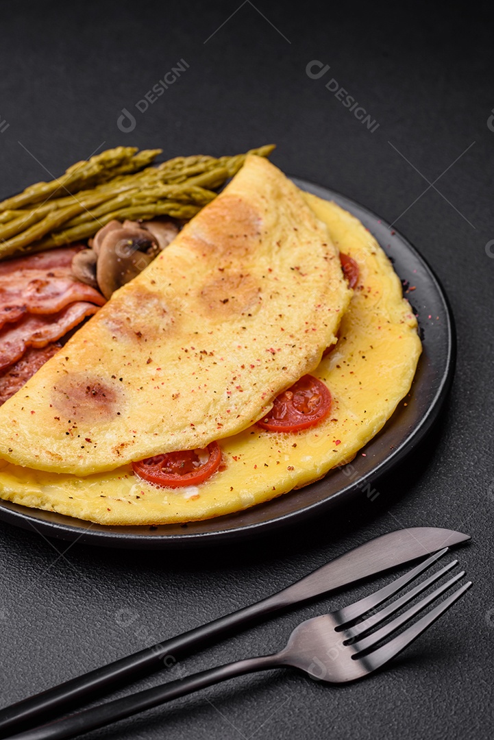Deliciosa omelete fresca com tomate cereja, bacon, aspargos e especiarias sobre um fundo escuro de concreto