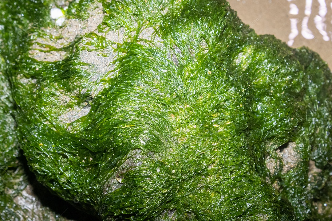 Algas verdes filamentosas tomando conta de uma rocha viva na praia.