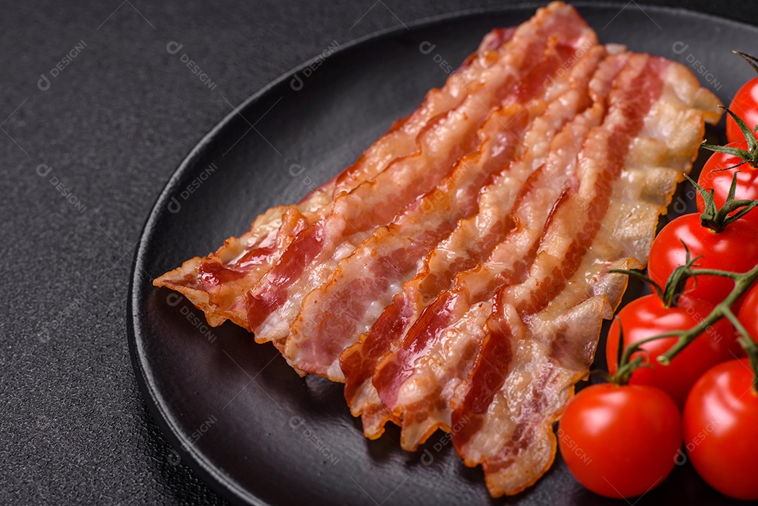 Delicioso bacon em forma de fatias com sal, especiarias e ervas sobre um fundo escuro de concreto