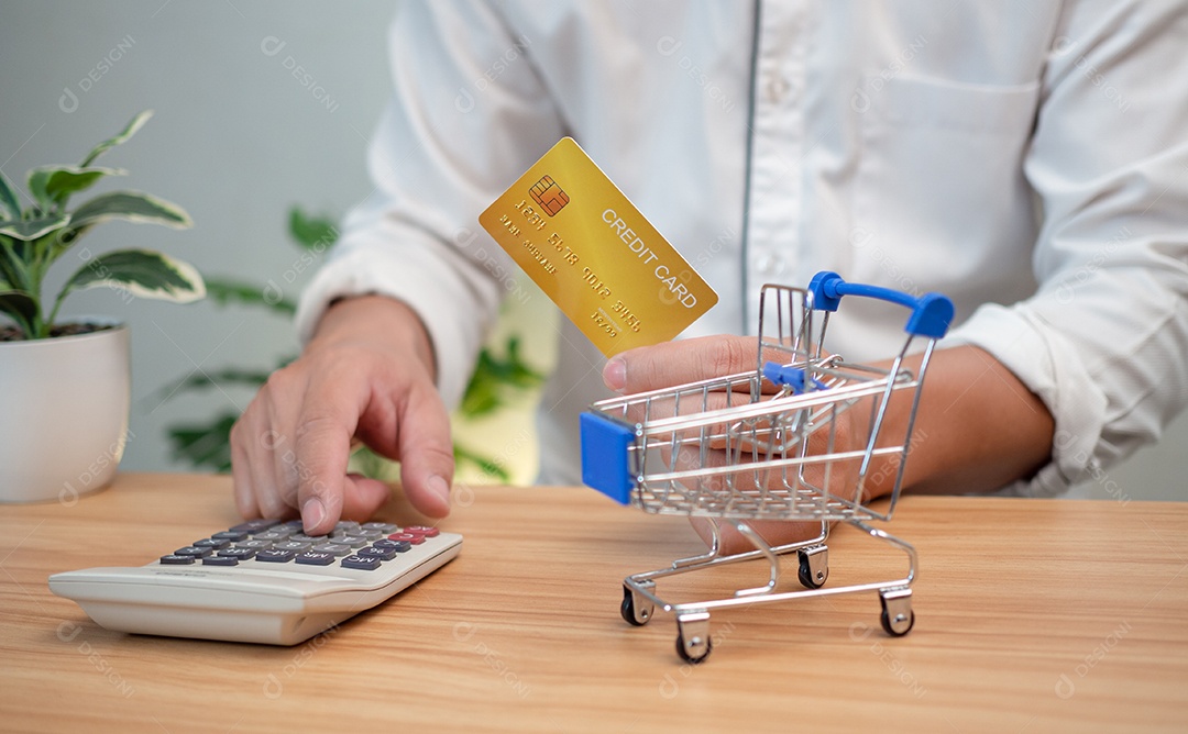 Homem segurando um cartão de crédito e pressionando uma calculadora...