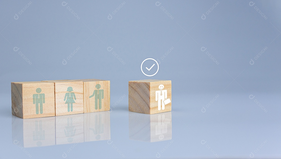 Conceito de Negócios e RH para liderança e líder de equipe. Um bloco de madeira cubo na frente Diferente e se destaca do grupo.