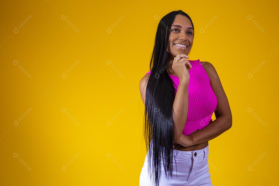 bela jovem morena com cabelo comprido sorrindo olhando para a câmera