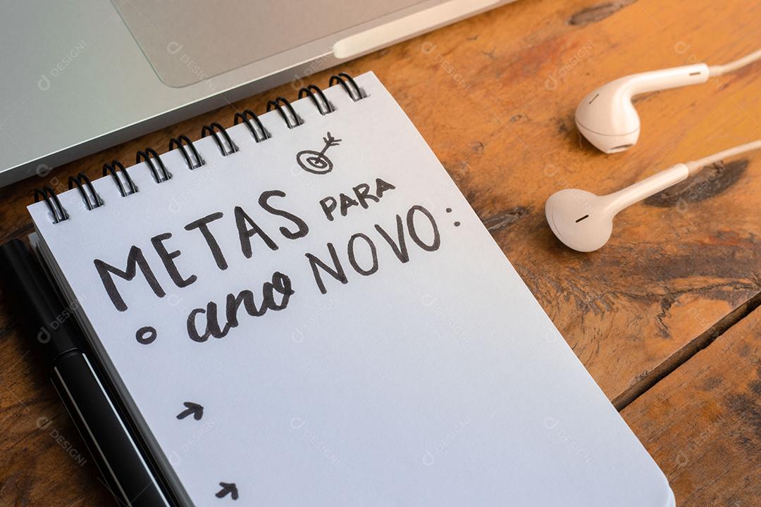Metas para o Ano Novo Bloco de Notas Sobre um Laptop na Mesa de Madeira JPG