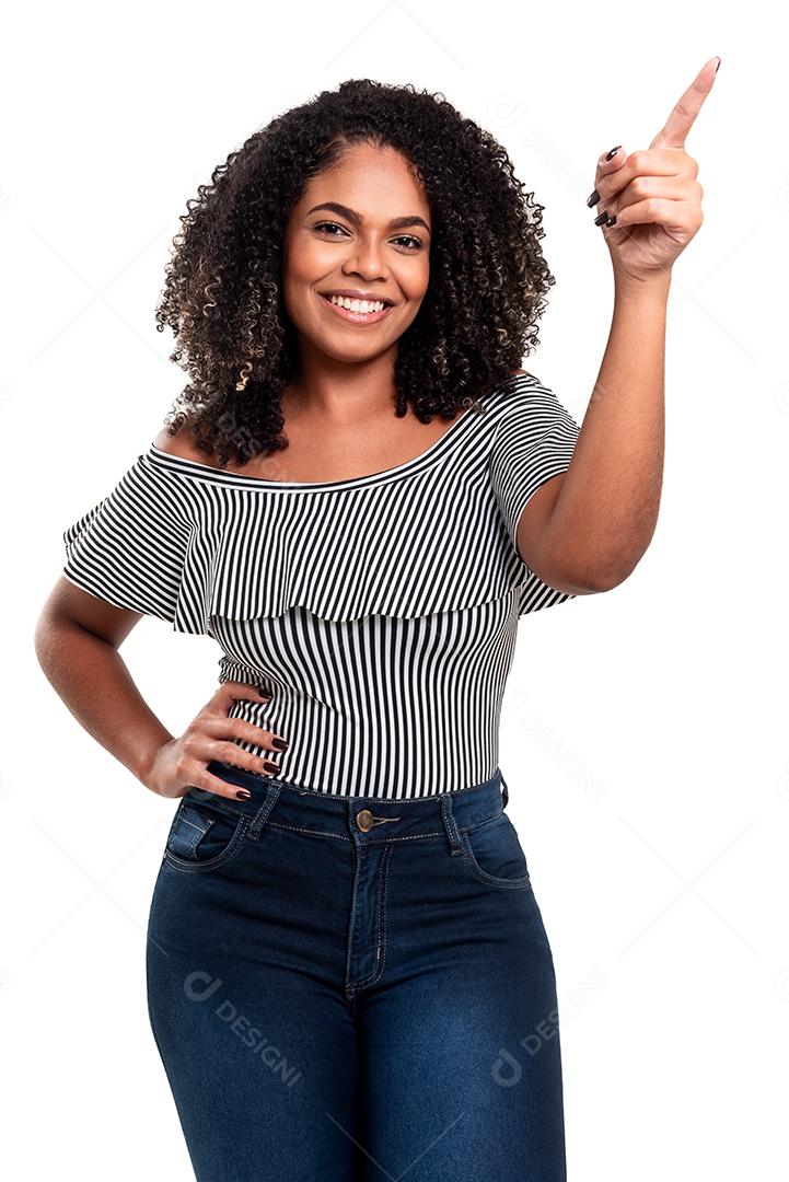 Fotografia de estúdio de jovem e elegante mulher negra sorrindo iso...
