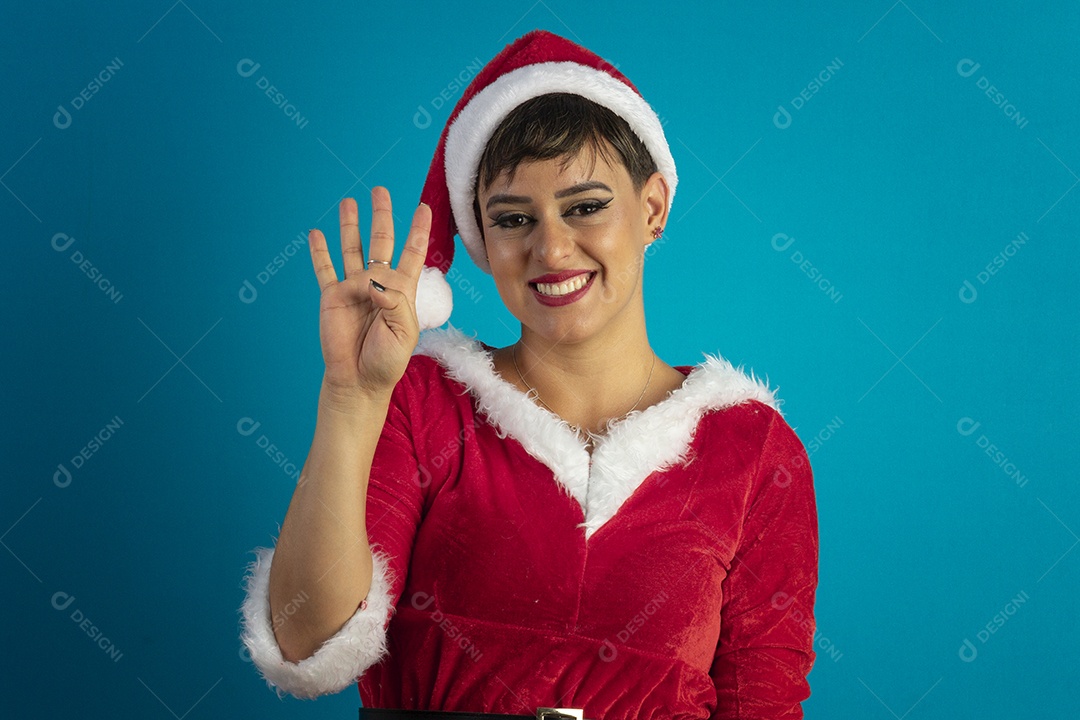 Linda mulher jovem com roupa de Mamãe Noel e chapéu