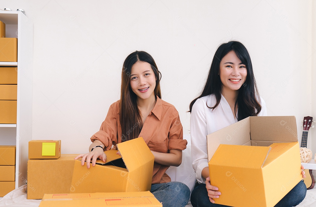 Freelancer mulheres asiáticas trabalho em equipe PME trabalhando no...