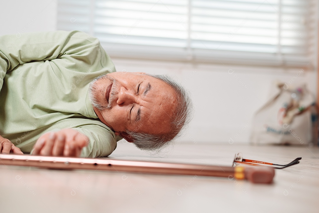 Homem sênior asiático caindo no chão com bengala na sala de estar e...