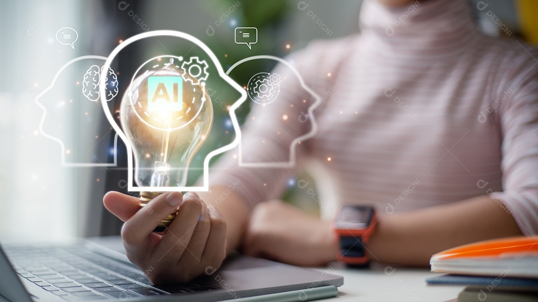 Mão segurando a lâmpada e a engrenagem dentro. Ideia e imaginação. ...