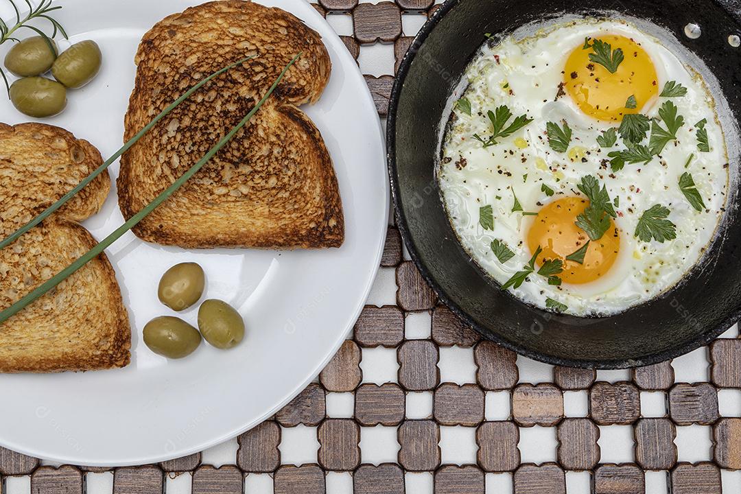 Ovos fritos com salsa em uma panela de ferro rústica, torradas Imag...