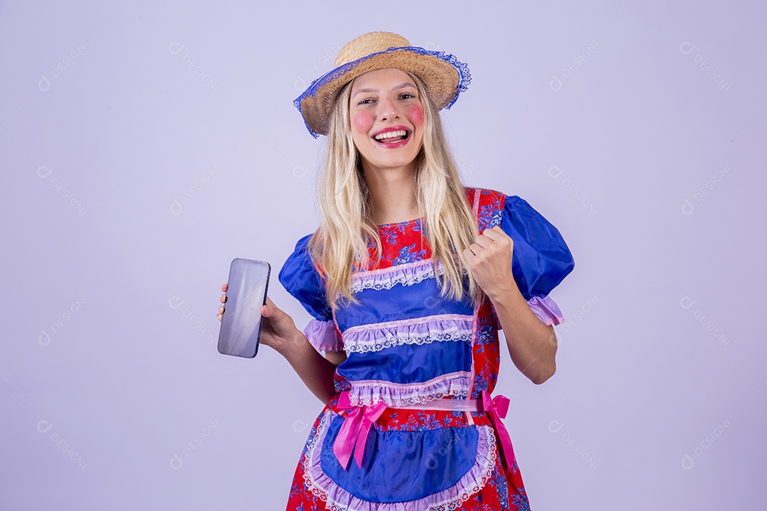 Linda mulher jovem fantasiada celebrando festas juninas sobre fundo...