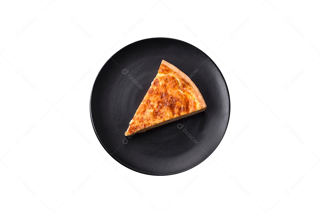 Linda e deliciosa torta de quiche com quatro tipos de queijo com especiarias e ervas em um fundo escuro de concreto