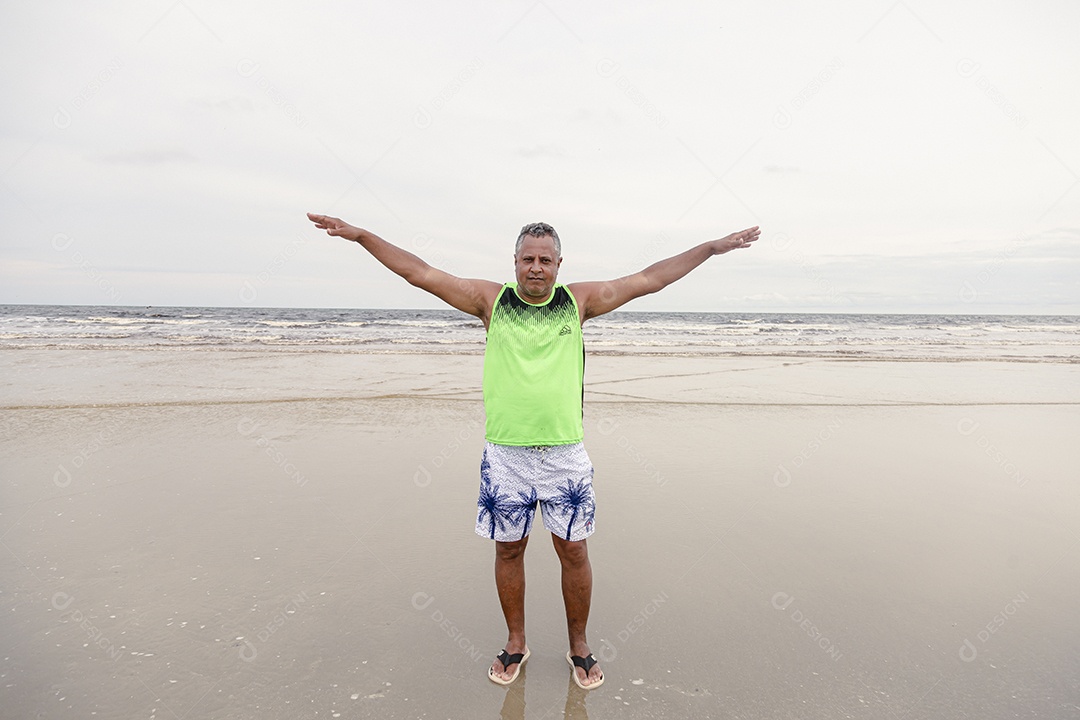 Homem de meia idade feliz sobre uma praia
