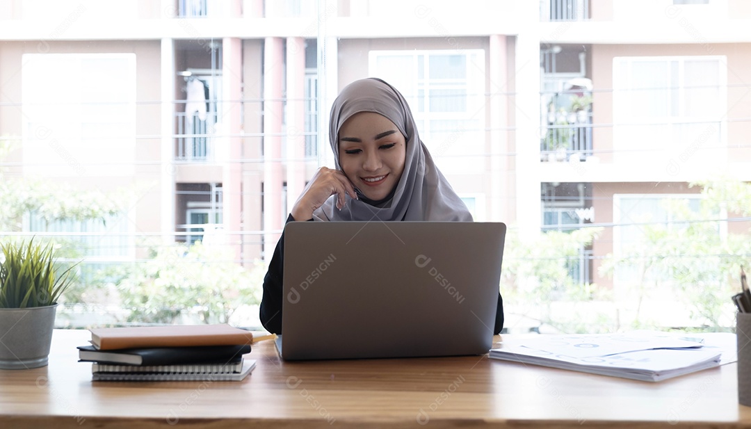 Mulher de negócios muçulmana jovem asiática em roupas casuais inteligentes, discutindo negócios