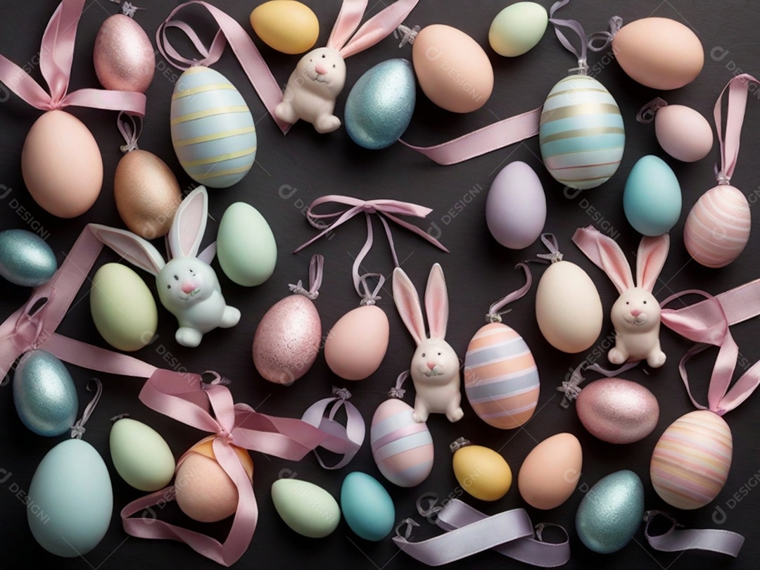 Várias decorações de Páscoa em tons pastéis, como fitas, faixas e e...