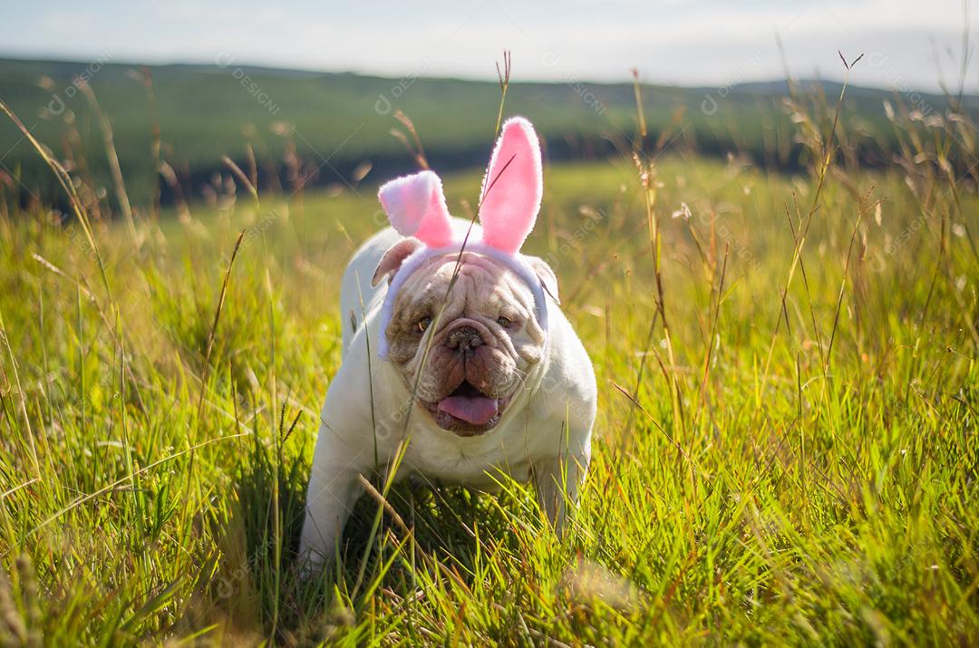 Grande conceito de Páscoa. Cão de raça bulldog inglês bonito vestido de coelhinho da Páscoa correndo no gramado.