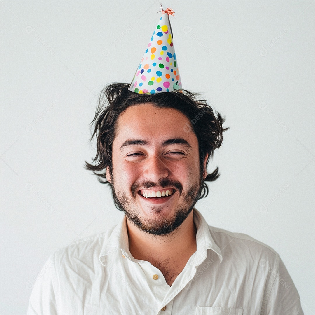 Homem sorridente, usando um chapéu de festa em um fundo branco