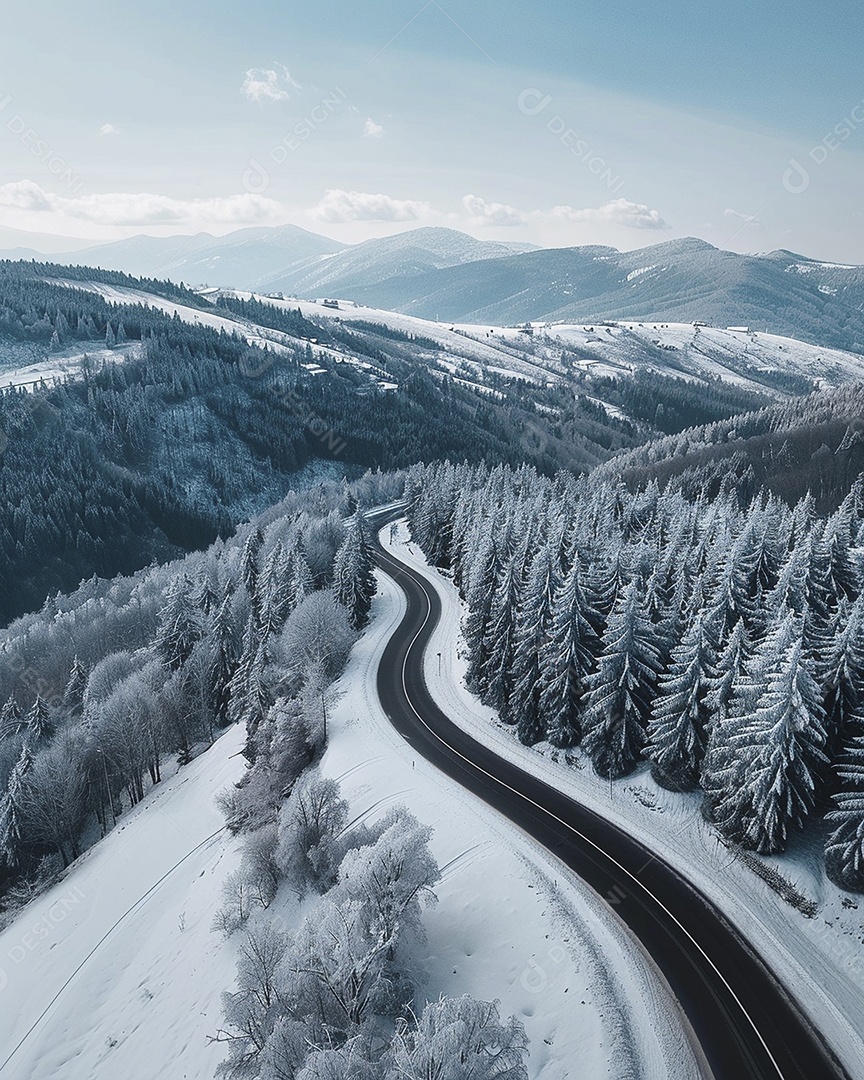 Vista aérea de uma estrada sinuosa nas montanhas com neve