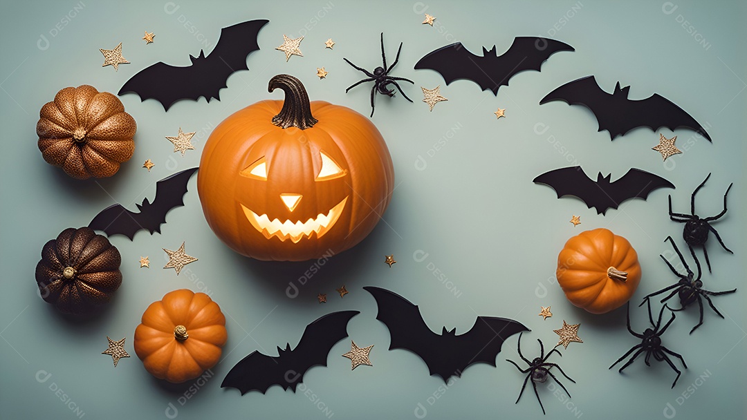 Abóbora de Halloween e morcegos em um fundo escuro. Conceito de Halloween.