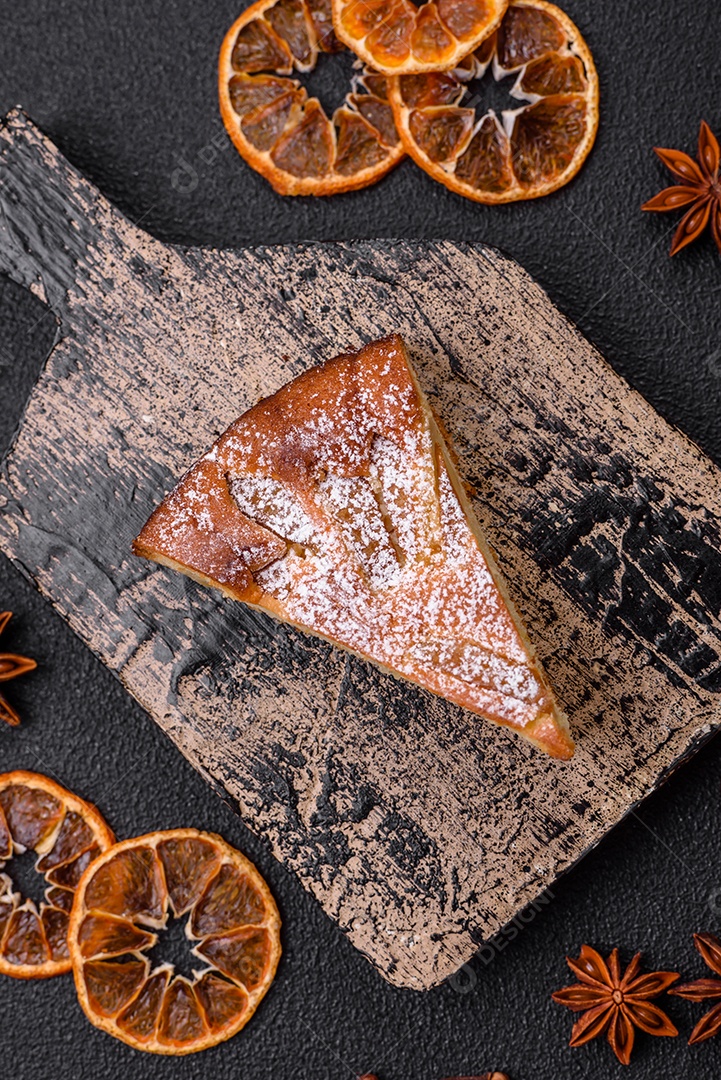 Um pedaço de torta caseira assada com maçã ou pêra, com canela, polvilhada com pó sobre um fundo escuro de concreto