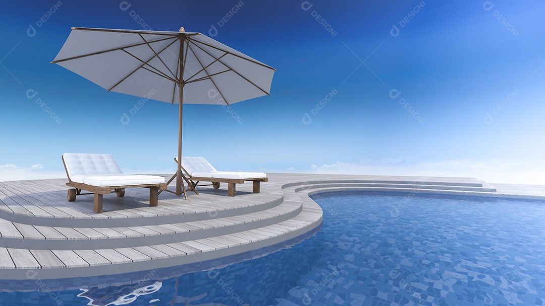 Sofá e guarda-chuva no terraço de madeira curva, piso de degrau, vista para o mar, piscina infinita, imagens de profundidade de campo.