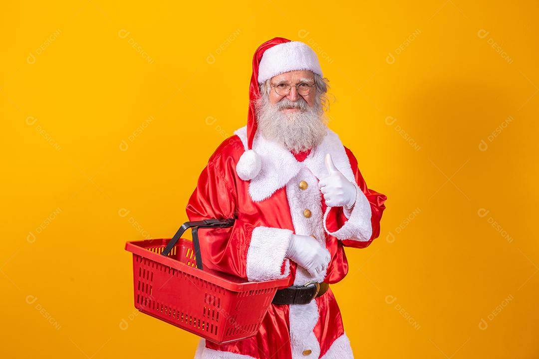 Papai Noel segurando uma cesta de compras vazia, olhando para a câmera sorrindo.