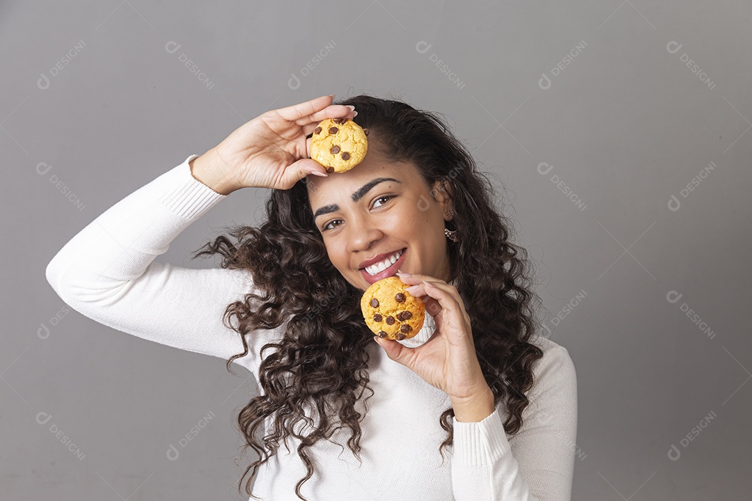 Linda mulher cabelo cacheado segurando biscoito sobre o rosto