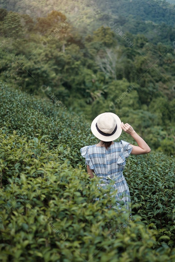 Feliz turista de vestido azul e chapéu aprecia o belo chá