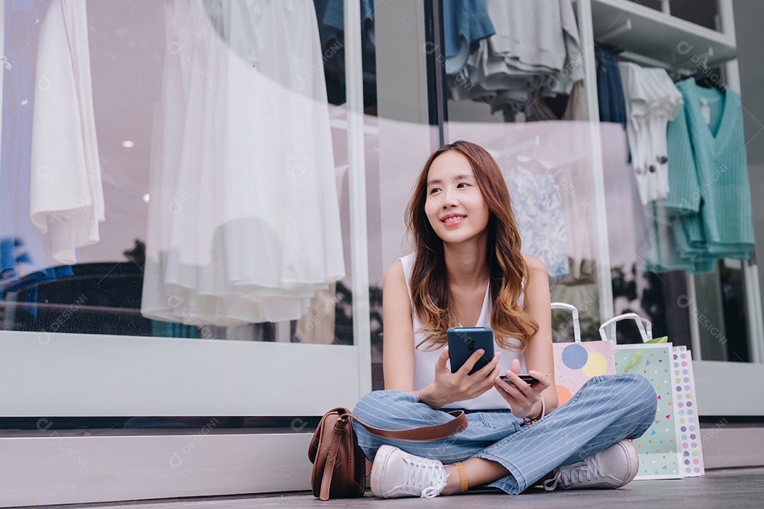 Mulher asiática cliente compradora usando cartão de crédito e smart...