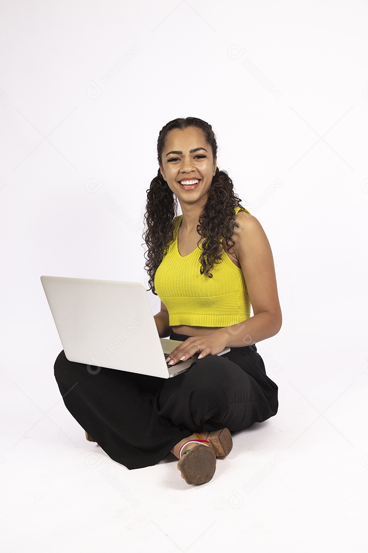 Linda mulher garota jovem segurando notebook laptop sobre fundo isolado