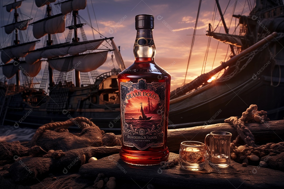 Garrafa de rum ou uísque em uma praia com um navio pirata ao fundo