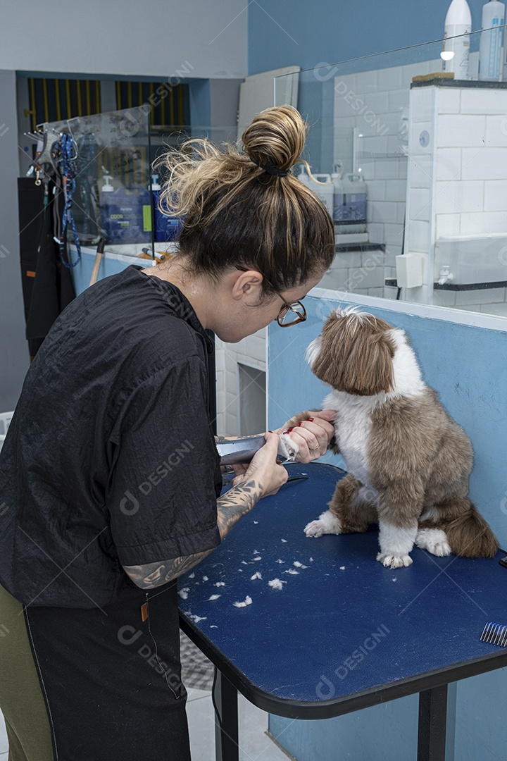Mulher dando banho em cachorrinho Shih Tzu em clínica de petshop