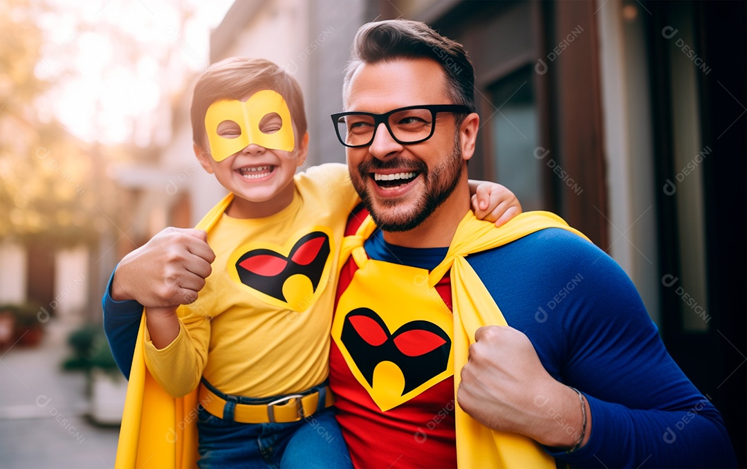 Pai e filho sorridentes com fantasias amarelas de super heroi