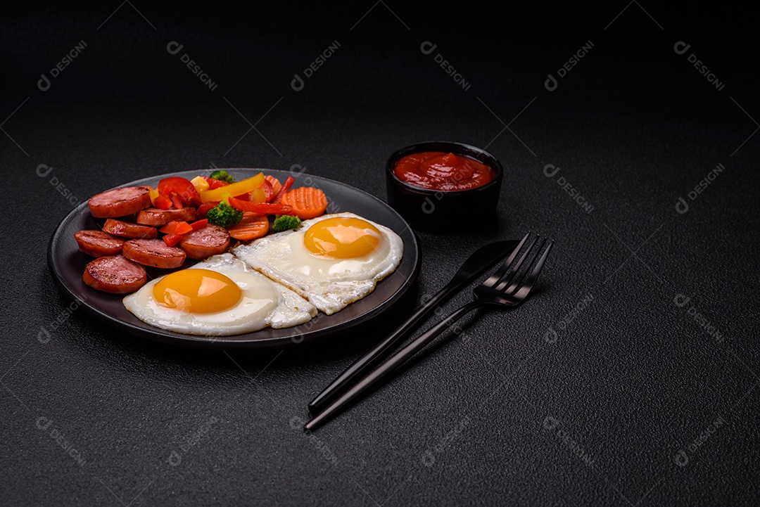 Delicioso café da manhã nutritivo com ovos fritos, salsicha, legumes cozidos no vapor com sal, especiarias e ervas sobre um fundo escuro de concreto