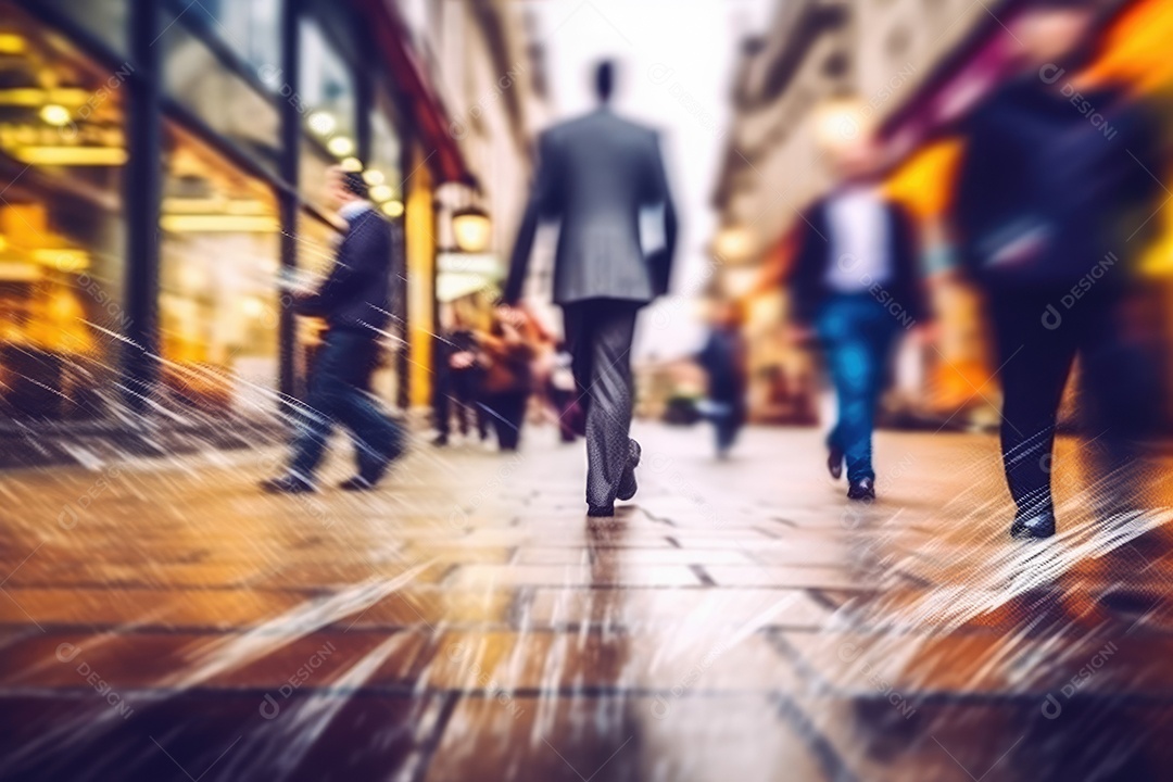 Multidão de pessoas andando na rua movimentada, movendo-se rapidamente pelo centro da cidade