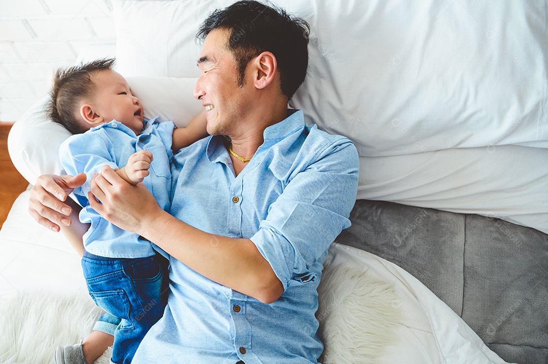 Pai asiático e filho brincando juntos na cama branca no quarto pela...