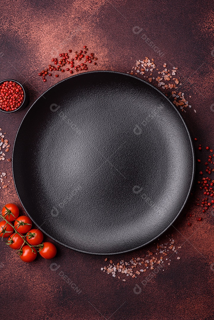 Placa redonda de cerâmica vazia em fundo de concreto texturizado escuro. Talheres, preparação para o jantar
