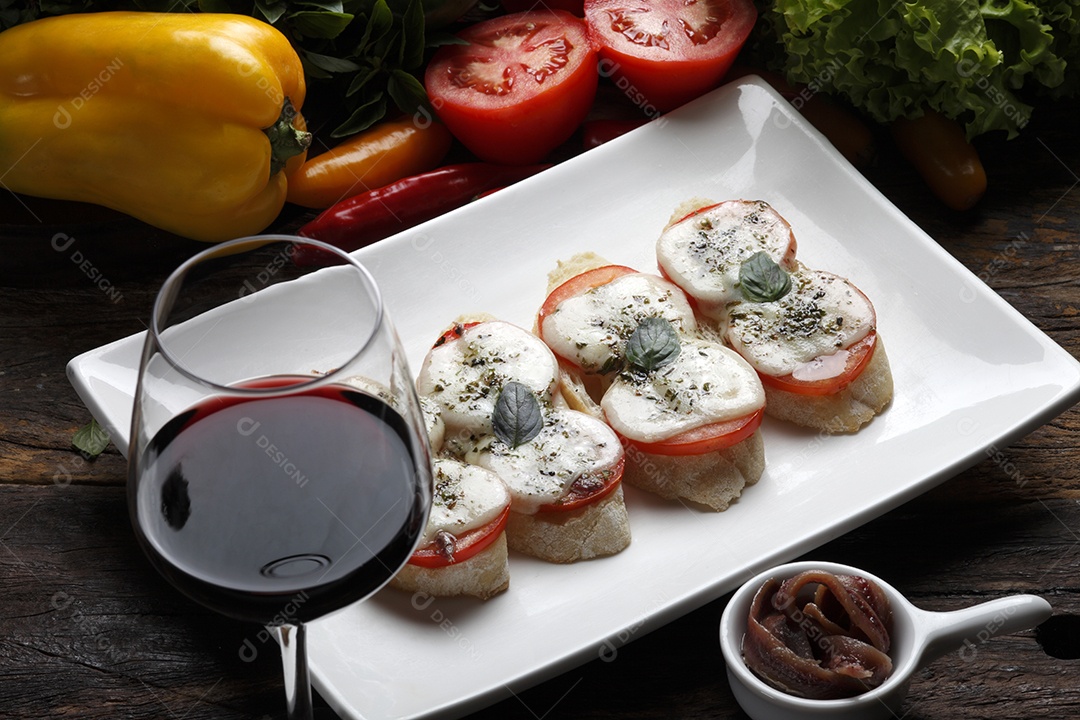 Deliciosas Bruschettas sobre tigela branca de cerâmica